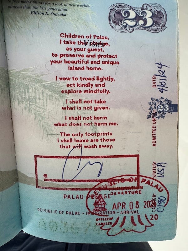 Palau stamps used to be a full-page environmental pledge into every visitor’s passport (they’ve since been made smaller). They’re a promise of stewardship you must sign, a stamp as a moral contract. One of the few places that asks not just where you’re coming from, but what kind of guest you plan to be.