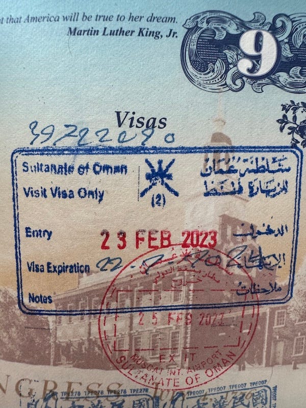 A red entry from Denmark, precise as everything else there. The beautiful Arabic from Oman, stamped before I headed into the Empty Quarter to camp. A crisp Hong Kong imprint from when it still felt independent, before Chinese politics tightened. Rugged Zimbabwe ink, smudged by a friendly female border agent’s thumb on a hot afternoon near Buffalo Range. A full-page Tanzanian visa, glued in at a desk in Kilimanjaro after an arrival on KLM.